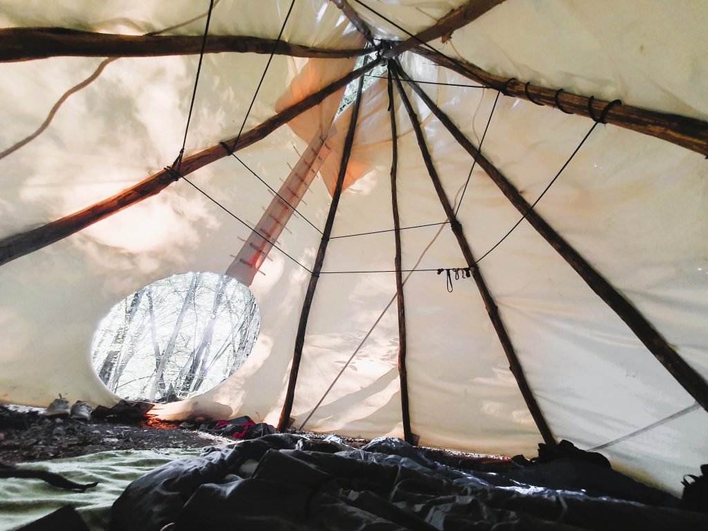 In dry weather, we pack our hiking backpacks and head into the forest to our tipi camp. We gather firewood, cook and eat together around the fire, play guitar and sing, and finally spend the night together in the tipi.